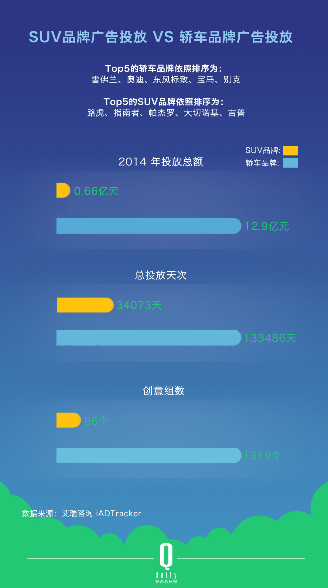 而在尼尔森网联提供给《好奇心日报》的 2014 Top 10 车型传统媒体(电视、平面和广播)广告花费中,SUV 车型只有 3 款,去年的总广告花费为 13.2 亿元;6 款为轿车,总广告花费为 31.4 亿元。