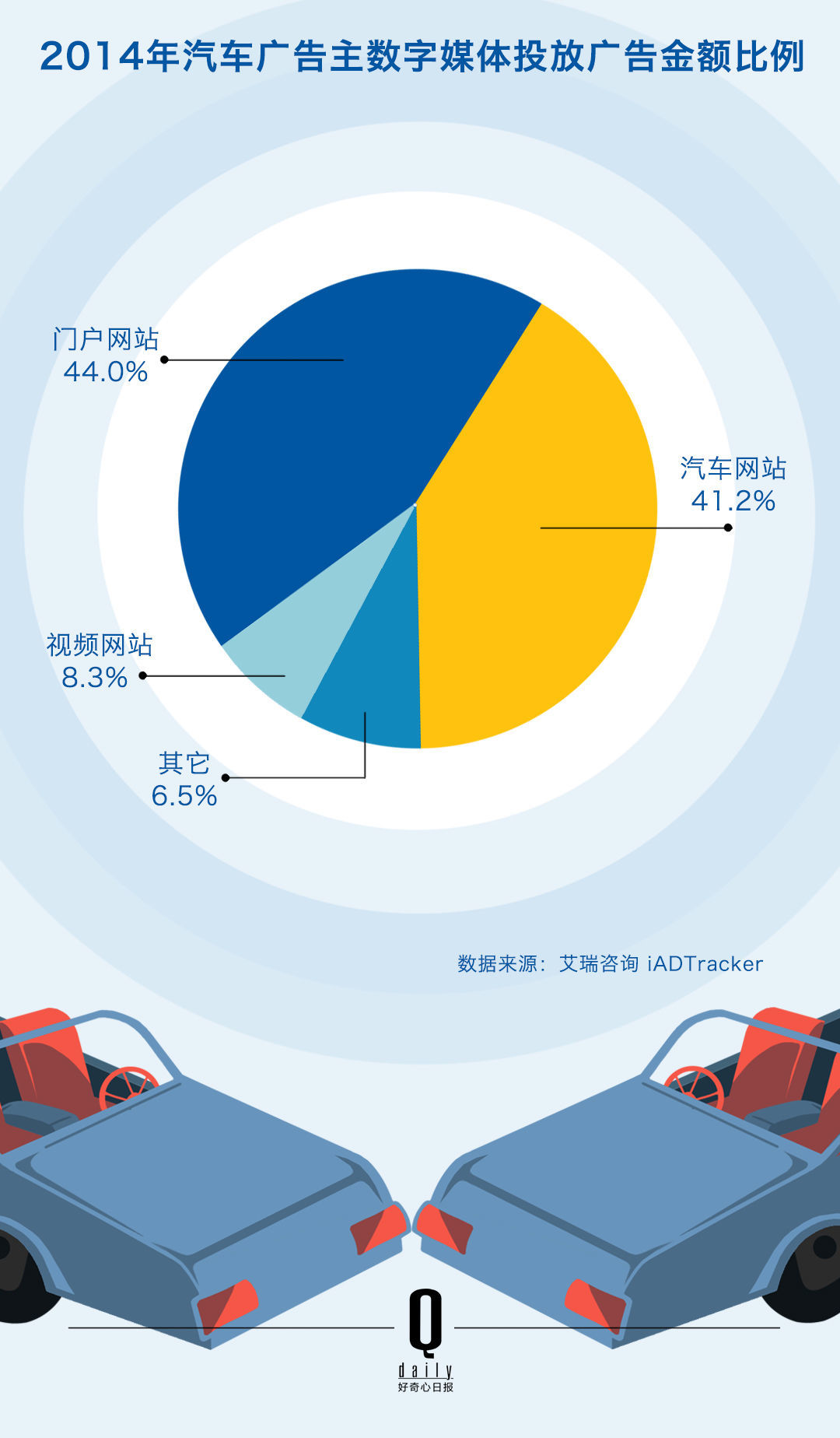 2014 年全年,根据艾瑞咨询的数据,汽车网站共吸引了 100 个广告主,而门户网站吸引的广告主数量为 89 个,这意味着虽然还没有把最多的钱花在汽车网站上,但已经有越来越多的汽车企业和品牌 CMO 把汽车网站放到了营销预算的那块拼图里面。