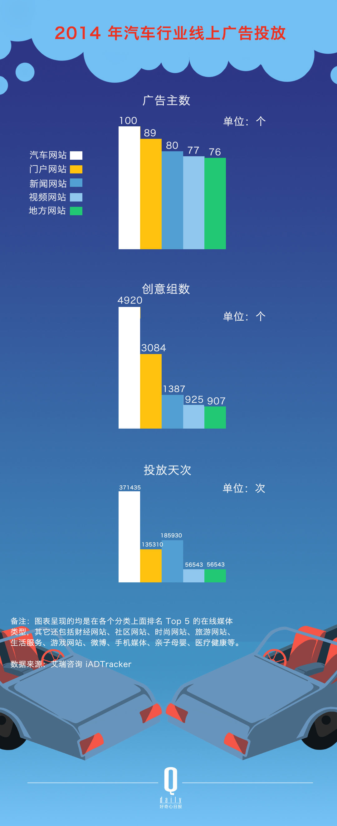 而从创意组数来看,汽车网站也是投放最多的数字媒体类型。汽车广告主 2014 年在线上投放了 4920 个创意组数,也就是说平均每天约有 13.5 个不同的汽车创意广告在汽车网站上上线。在广告投放天次上,汽车网站也同样是排在第一。