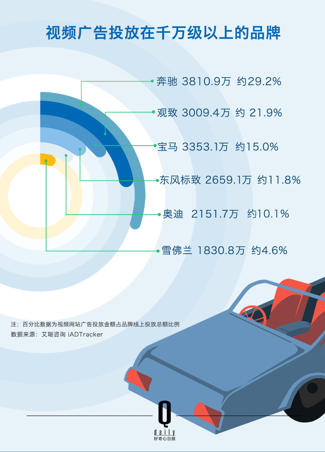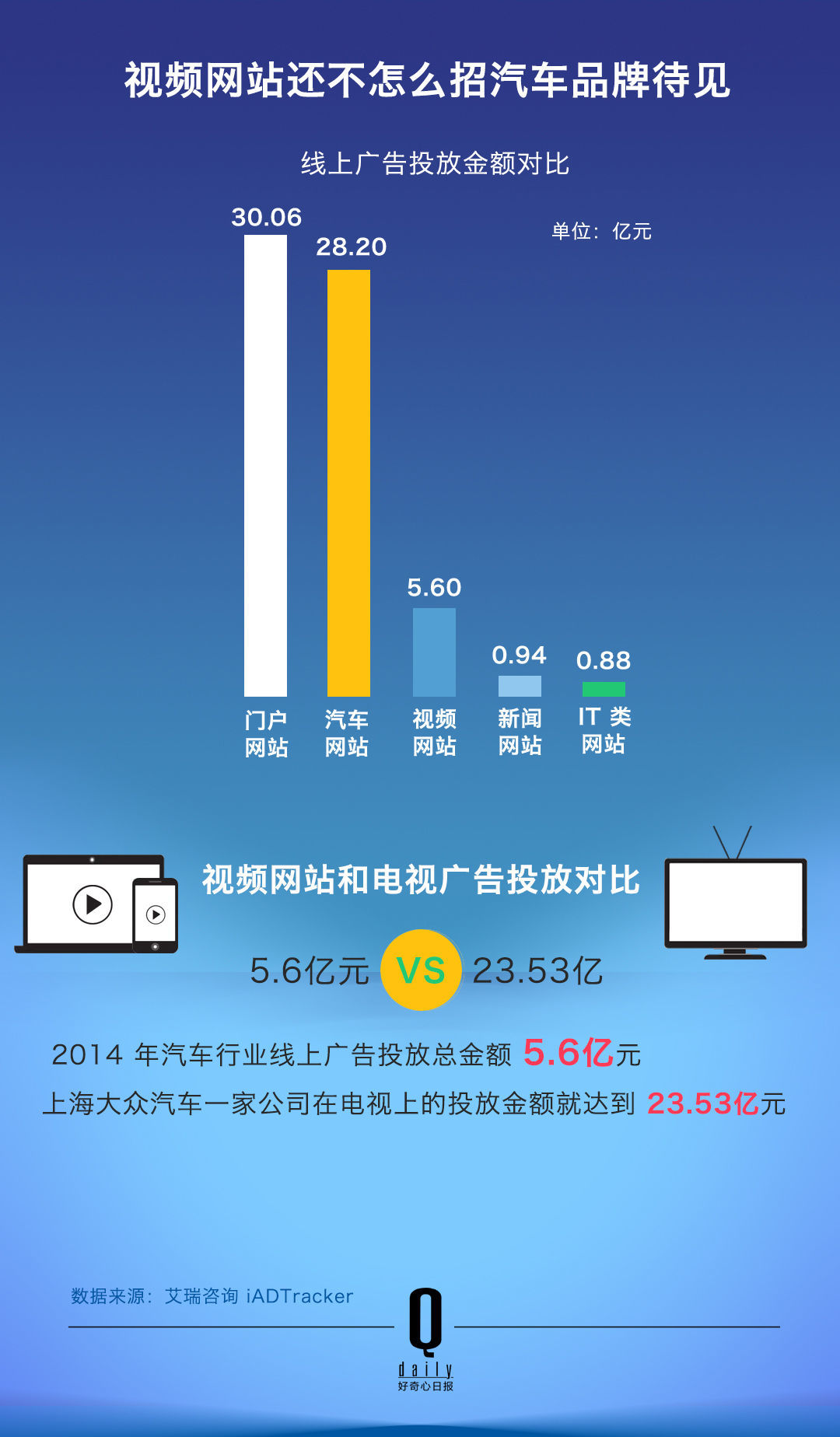 从 2014 年的线上汽车广告投放金额来看,视频网站排在第三,但投放金额只有 5.6 亿元,和排在前两位的门户网站、汽车网站差了一大截。如果再拿它来和电视相比,你会看到上海大众一家汽车公司 2014 年在电视上的投放金额就达到了 23.53 亿人民币。