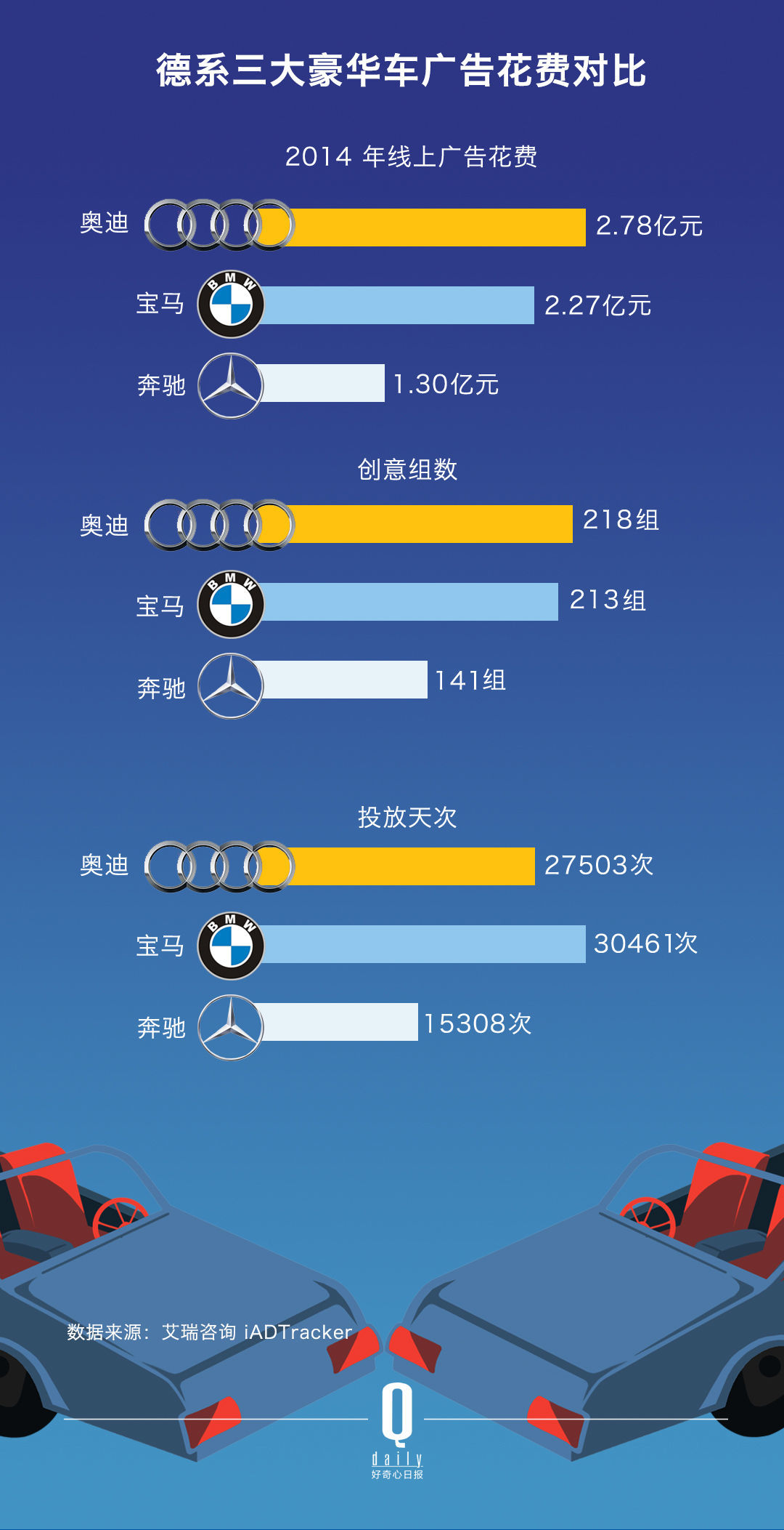 在中国豪华车市场占有 80% 左右市场份额的德系三大豪华车品牌:宝马、奥迪和奔驰,2014 年广告花费最多的是宝马,它在尼尔森网联提供的 2014 传统媒体广告花费 Top 10 汽车品牌榜单中,以 15.77 亿元排在第三;在艾瑞咨询提供的 2014 线上媒体广告花费 Top 10 汽车品牌中,又以 2.27 亿元排在第四。奥迪在艾瑞咨询的这份榜单中,排在第二位。奔驰没有进入任何一个榜单,在创意组数和投放天次上,奔驰都落后于宝马和奥迪,它可能是花的最少的。