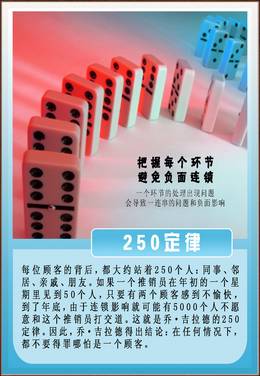 原理:每一个顾客的背后,大体上都有250名亲朋好友,这些人又会有同样多的关系,因此,开罪一名顾客,将会失去几十名、数百名甚至更多的潜在顾客。相反则会产生同样大的正效应。