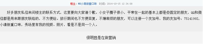 本月13日中午,在中国最热门的几家社交网站猫扑、天涯、豆瓣等上面,都出现了一条《用身体旅行:95后萌妹向全国征集各地临时男友陪游啦!》的帖子。贴主ID为“ME小清新重口味”,其帖文虽然打着“旅行”的幌子,但字里行间都在表明愿意“陪睡”。