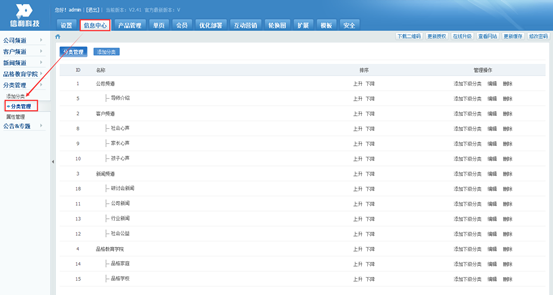 信息中心栏目会根据网站的需求,左侧会有多个频道。每个频道下都可以进行分类 和 添加信息。