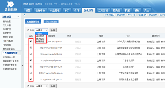 管理方法同文章类似,可以通过上升 或 下降调整顺序,以及批量删除友情链接