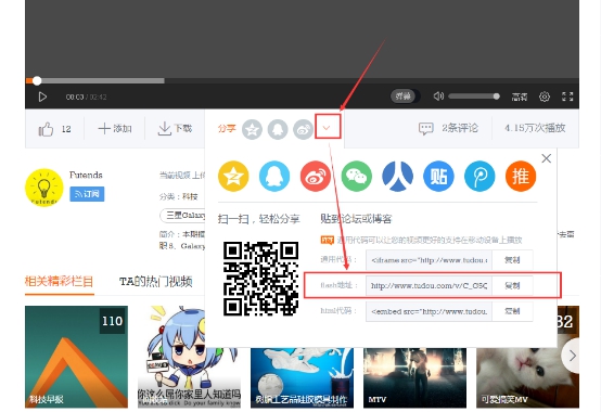 然后,获得视频的链接地址,这个也是很多人会搞混的地方。点击视频下面的分享按钮,如下: