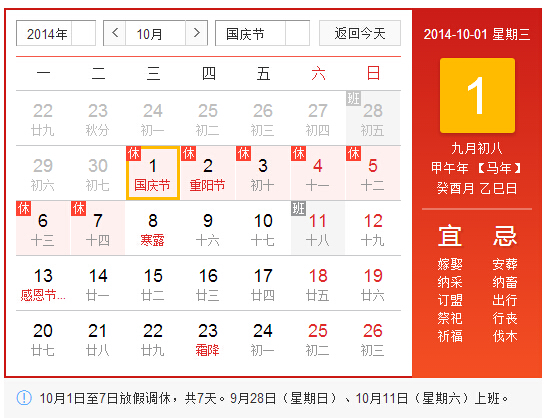 放假时间:2014年10月1日至2014年10月7日,9.28和10.11补班。