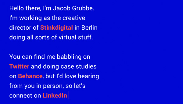 玩弄色彩还是挺容易玩出花样的,虽然有时候看起来略显奇怪,但是配合上富有表现力的字体,反而会成为网站的亮点。Montserrat 和 Courier New 都不是以有趣好玩为卖点的字体,但是在这个网站就显得特别突出。