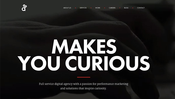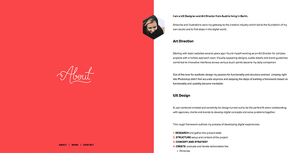 左右对称的网站越来越多,这个网站除了左侧的标题之外,正文部分仅用了一种字体:Proxima Nova。正文部分,设计师通过不同字重的对比而呈现出网站的层次(实际上我们也经常这样做),少许自定义的字体则赋予了网站以个性。