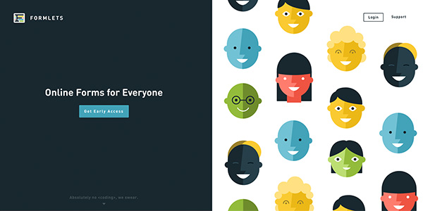 虽然Formlets家的产品迟迟没有突出,但是他们的网站还是非常亮眼的。个性化的脸谱插画和现代感十足的字体搭配在一起,呈现出同类企业所不具备的个性和气质。DIN和Roboto谁不知道呢?但是要作出这样的网站,只能说功夫在诗外了。