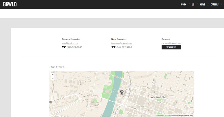 BKWLD的联系页,除了一些基本的邮件/电话信息,添加了MAPbox动态地图,调高了交互性。