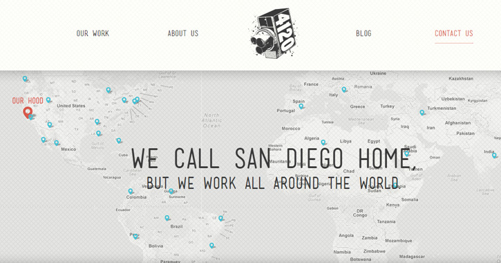 也可以考虑使用一个定制的照片,不用JavaScript地图。在FortyOneTwenty网站联系页面,使用一个世界地图,上面的蓝点标注了全球分公司和员工分布情况。