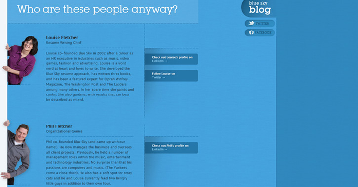 Blue Sky Resumes网站的“关于我们”页面包含一段团队的介绍。每个雇员都有自己单独的网页链接。