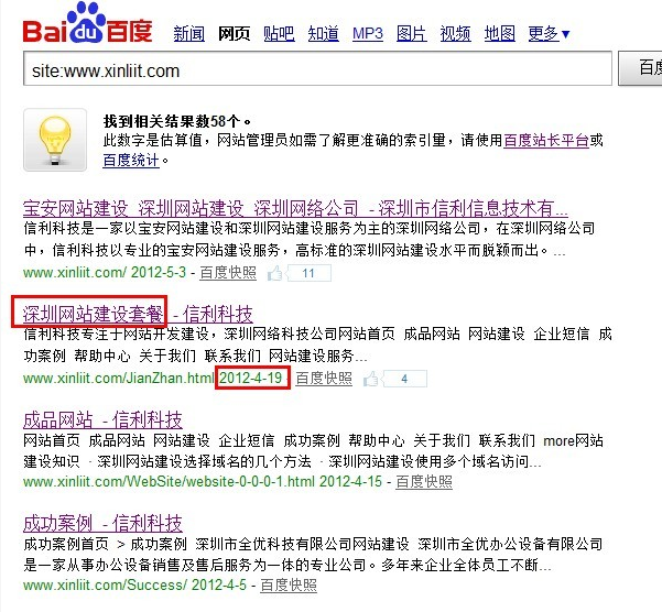 网站建设这个栏目我们在4月21日将标题更改成为了西乡网站建设套餐,但经过了很长时间,百度的收录标题仍然还是深圳网站建设套餐。而其它生成纯静态页面的百度收录就非常及时。