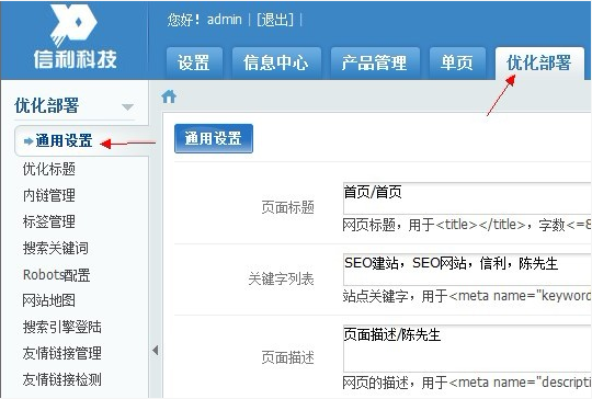 在进入后台后,在上方导航找到“优化部署”项,点击左边的“通用设置”项进入标题设置。