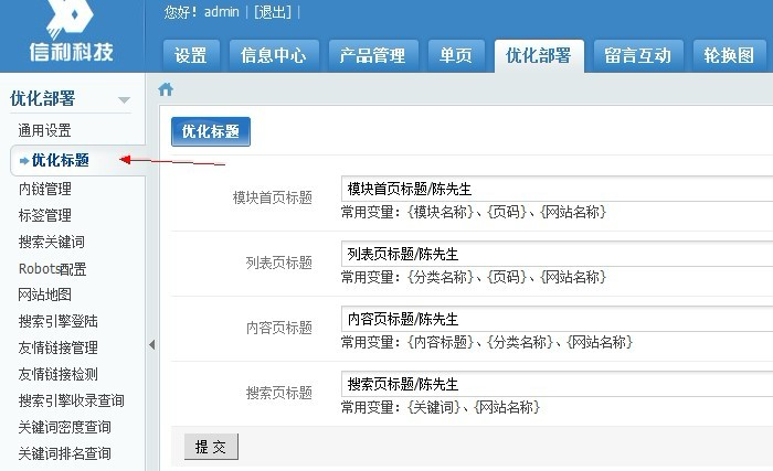 而在优化标题中可以分模块设置网页标题,并列出了能够使用的变量